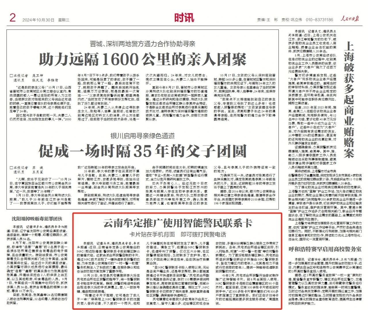 近日,云南省牟定县公安局推出的NFC(即近场通信)警民联系卡受到辖区群众的普遍欢迎。这款由派出所民警自制的卡片,通过NFC技术实现了一键快速联系民警的功能,为牟定县公安局推行的“一村一警一助理”警务机制注入了科技的力量,在服务群众和社会治安防控方面发挥了重要作用。10月20日,牟定县凤屯镇居民李大妈在凤屯派出所社区民警的指导下,将一张警民联系卡贴在手机背面。瞬间,民警的电话号码就出现在李大妈手机屏幕上,老人一按拨号键,通话即刻被接通。“别看这卡片不起眼,它可是救了我儿子一命!”早早用上NFC警民联系卡的沈国庆老人告诉记者,不久前的一个雨天,他和儿子骑摩托车在转弯时发生了意外,儿子重伤昏迷。情急之下,他摸出NFC警民联系卡,迅速呼叫了民警。仅仅五六分钟,社区民警便赶到现场,及时联系了救护车,老人的儿子因此得以保住性命,经住院治疗后康复出院。“自NFC警民联系卡投入使用以来,无论是咨询户籍业务,还是寻求帮助,群众都能直接通过卡片快速联系到民警。”凤屯派出所副所长周国良告诉记者,拨打110需要详细说明事发地点,再转接至相应管辖的民警,而部分群众难以准确描述具体位置。相比之下,NFC警民联系卡已预存了相关信息,能够直接连通社区民警,确保能够快速响应。凤屯镇青壮年居民大多数常年外出务工,空巢老人、留守儿童众多,这给辖区的社会治安防控、矛盾纠纷调解及群众服务工作带来了新挑战。去年,凤屯派出所结合辖区实际,引入网格员,构建“一村一警一助理”等农村警务新模式。为了更好地服务辖区群众,凤屯派出所组织民警创新设计并推出NFC警民联系卡,旨在为辖区内的老年人,尤其是视力不佳或行动受限的老年人,提供一种能够迅速联系到民警的方式。今年2月,凤屯派出所民警开始尝试制作推广这种智能卡片。到8月全面投入使用,NFC警民联系卡海报已经覆盖辖区的90个自然村。截至目前,已有500余张卡片被送到村民手中。“这500多张卡片意味着我们与500多户家庭建立了直接联系。我们正在计划将卡片的功能拓展到更多民生服务领域。”周国良说。