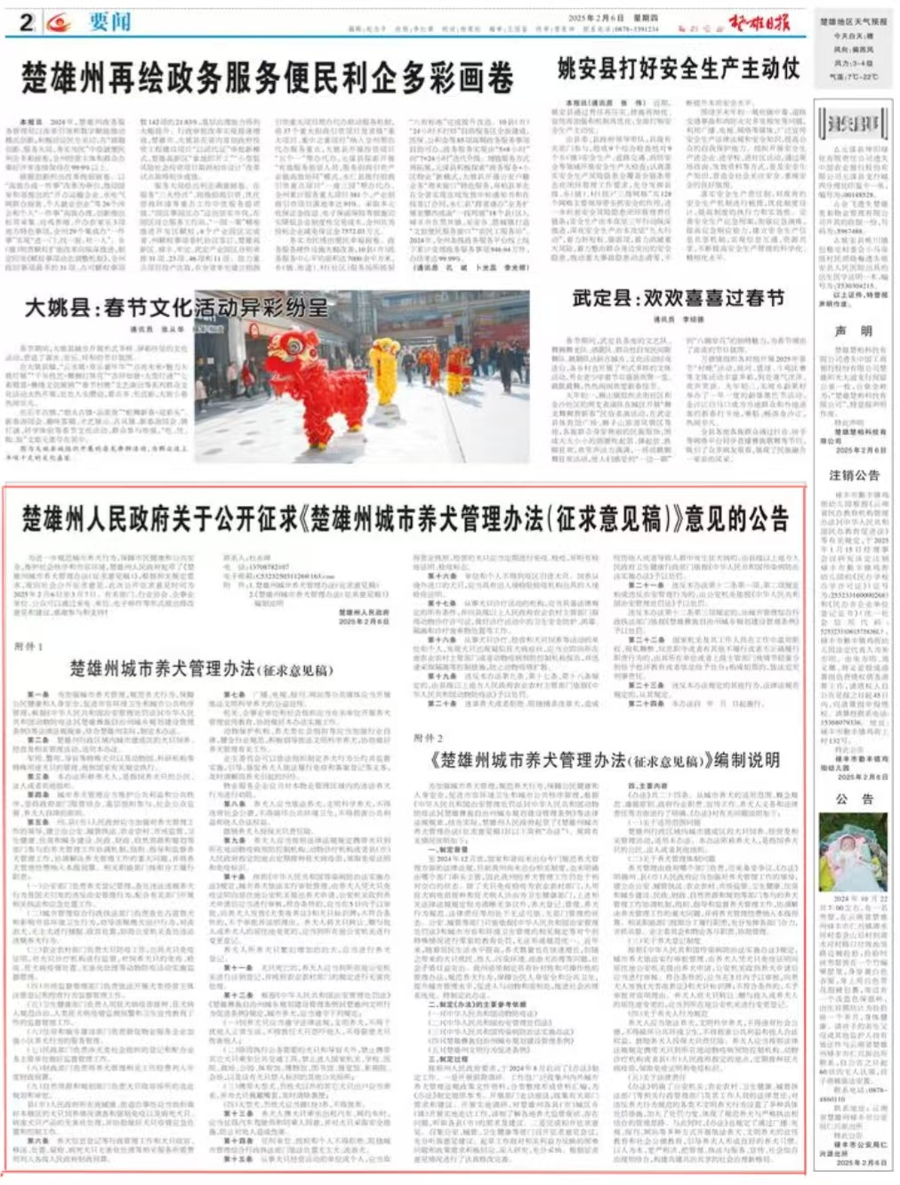 为进一步规范城市养犬行为,保障市民健康和公共安全,维护社会秩序和市容环境,楚雄州人民政府起草了《楚雄州城市养犬管理办法(征求意见稿)》,根据相关规定要求,现向社会公开征求意见,此次公开征求意见时间为2025年2月6日至3月7日。有关部门、行业协会、企事业单位、公众可以通过来电、来信、电子邮件等形式提出修改意见和建议,感谢参与和支持!