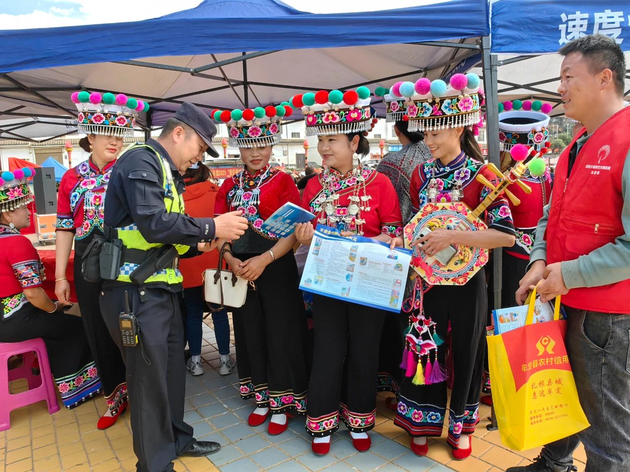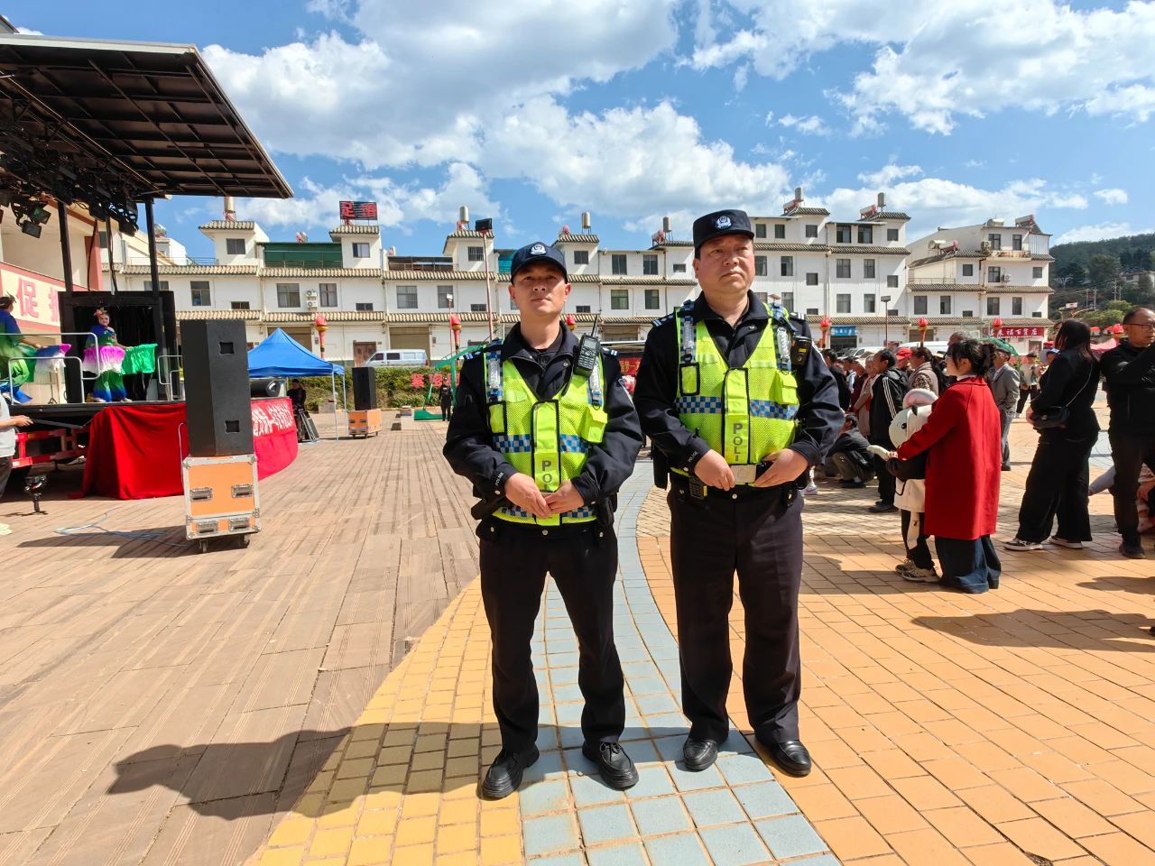 戌街集镇中心村各条街道物资商品琳琅满目,文化广场上龙狮表演、花灯剧、左脚舞等文艺演出活动相继上演,针对现场活动多、人流量大的特点,参与执勤的警力坚守在各执勤点位,全力做好现场秩序维护、巡逻防控、交通疏导等各项安保工作,确保活动安全有序进行。