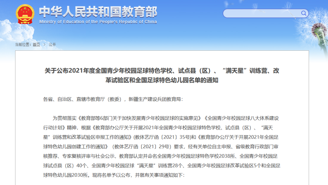 日前,教育部发布通知,并公布2021年度全国青少年,校园足球特色学校试点县(区)、“满天星”训练营改革试验区和全国足球特色幼儿园名单