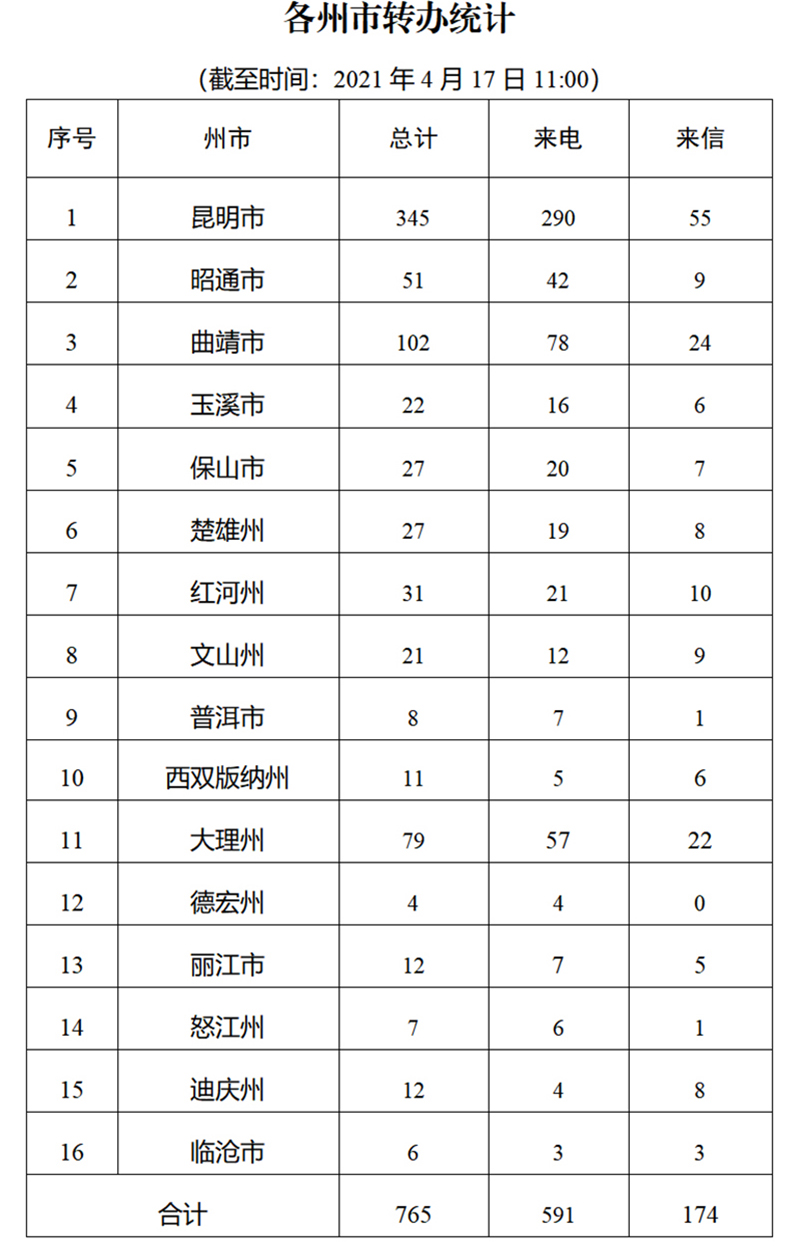 截至4月17日上午11:00,督察组交办群众举报投诉生态环境问题共十一批765件(来电591件、来信174件);其中,昆明市345件,曲靖市102件,大理州79件,昭通市51件,红河州31件,楚雄州27件,保山市27件,玉溪市22件,文山州21件,迪庆州12件,丽江市12件,西双版纳州11件,普洱市8件,怒江州7件,临沧市6件,德宏州4件。