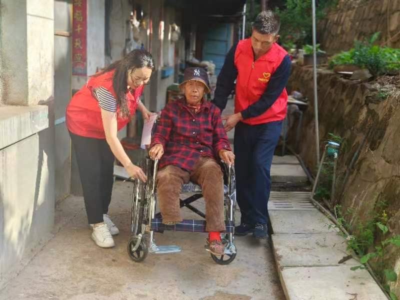 图为:新桥镇残联工作者为残疾人“零距离”发放轮椅。