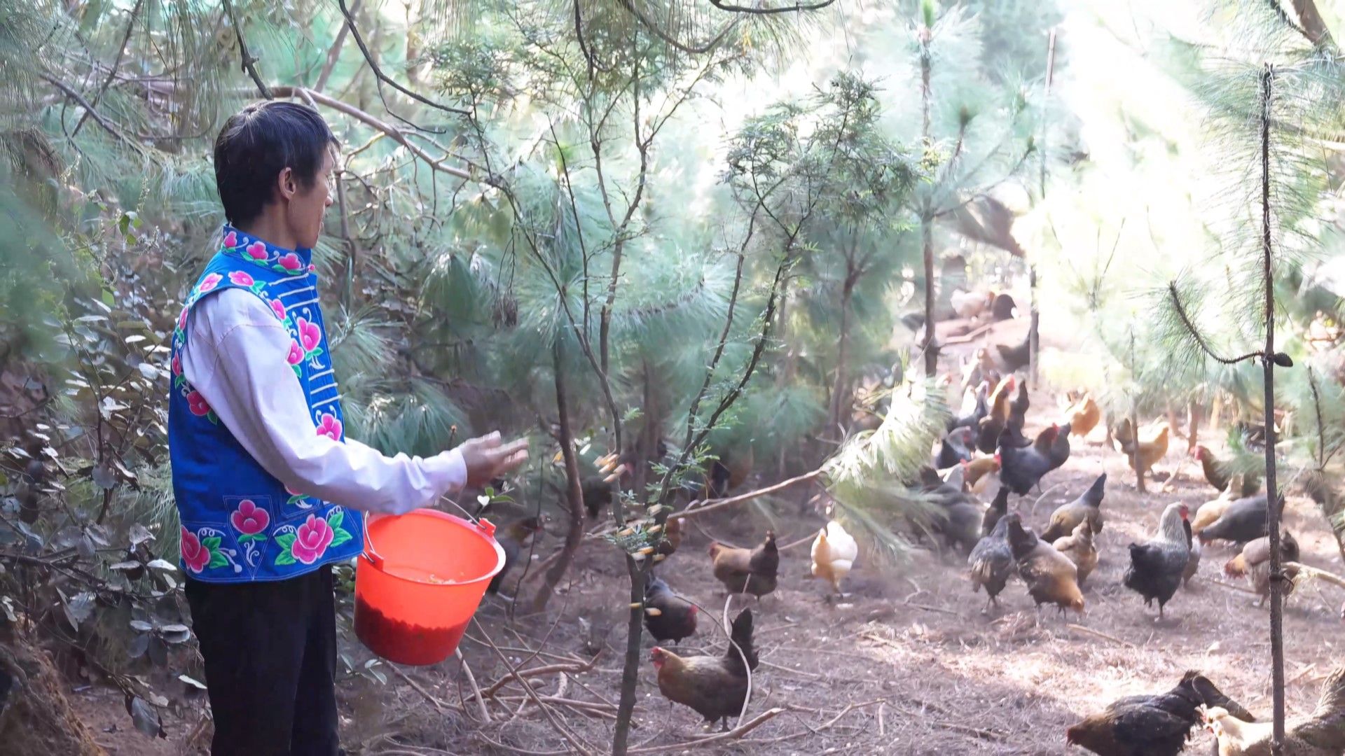 在牟定县蟠猫乡碑厅村委会上炉子村牟定凯燕农牧有限责任公司的养殖基地里,“咯、咯、咯”的鸡鸣声此起彼伏,数千只鸡或在林间追逐啄食,或振翅飞上枝头栖息,原生态的养殖场里充满野趣与生机。蟠猫乡:山林土鸡“养”出生态致富路