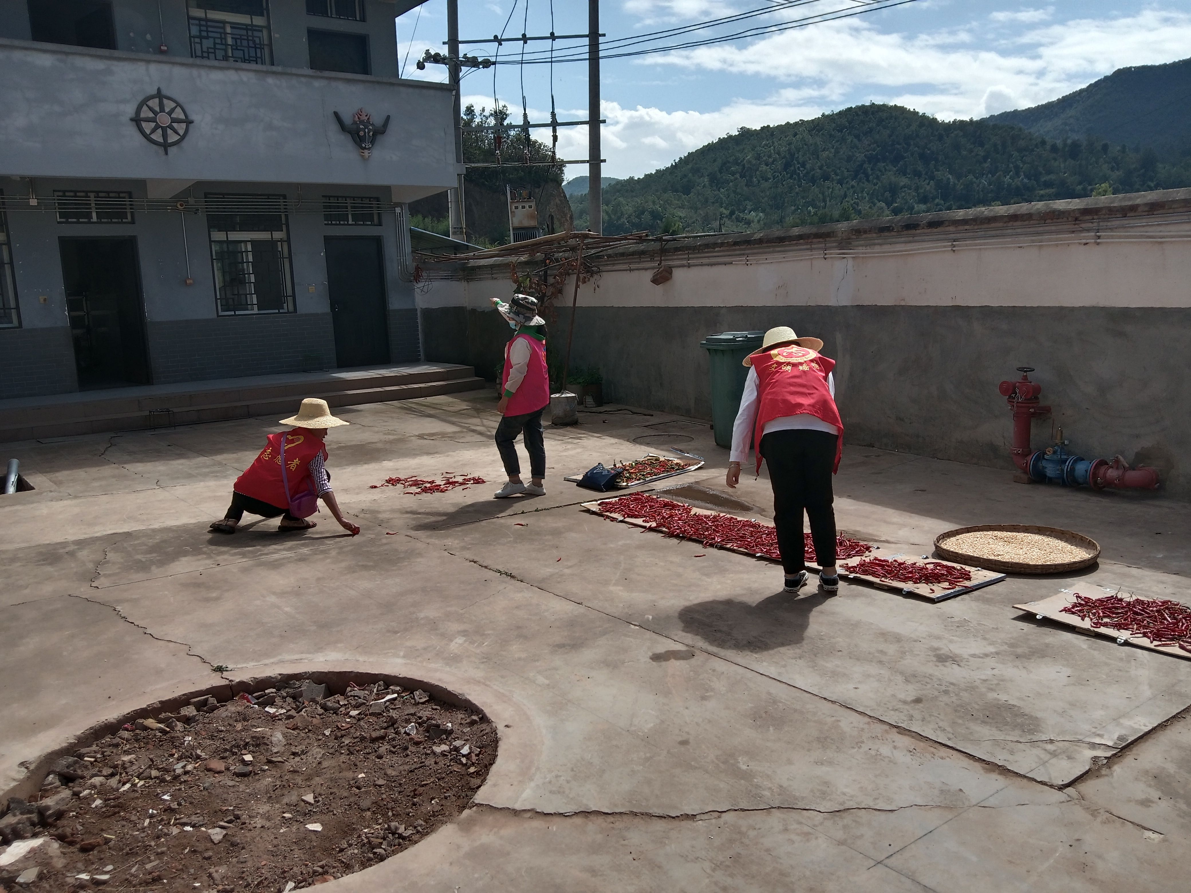 (图为蟠猫乡志愿者为院民晾晒新收获的辣椒)