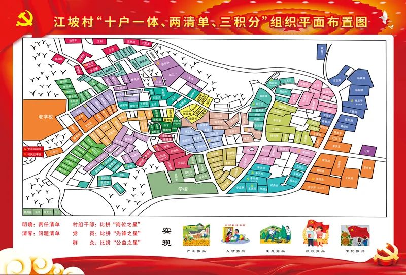创立村组干部争创岗位积分、党员争创先锋积分、普通群众争创公益积分。按照《江坡镇村组干部“岗位积分”评分办法》《江坡镇共产党员“先锋积分”评分办法》和《江坡镇群众“公益积分”评分办法》,以村组干部在村务管理中的行为表现、中共党员在群众中的影响力及群众认可度、普通群众对村级事务的参与度等作为衡量依据,由村“两委”组建积分评议小组和监督管理小组,定期开展检查评比、张榜公示,核发当月积分卡。村内专门设立“道德积分超市”,积分券每一积分对应1元人民币,本地村民可凭积分券兑换商品,通过“小积分”激发群众共建共治的“大动能”。