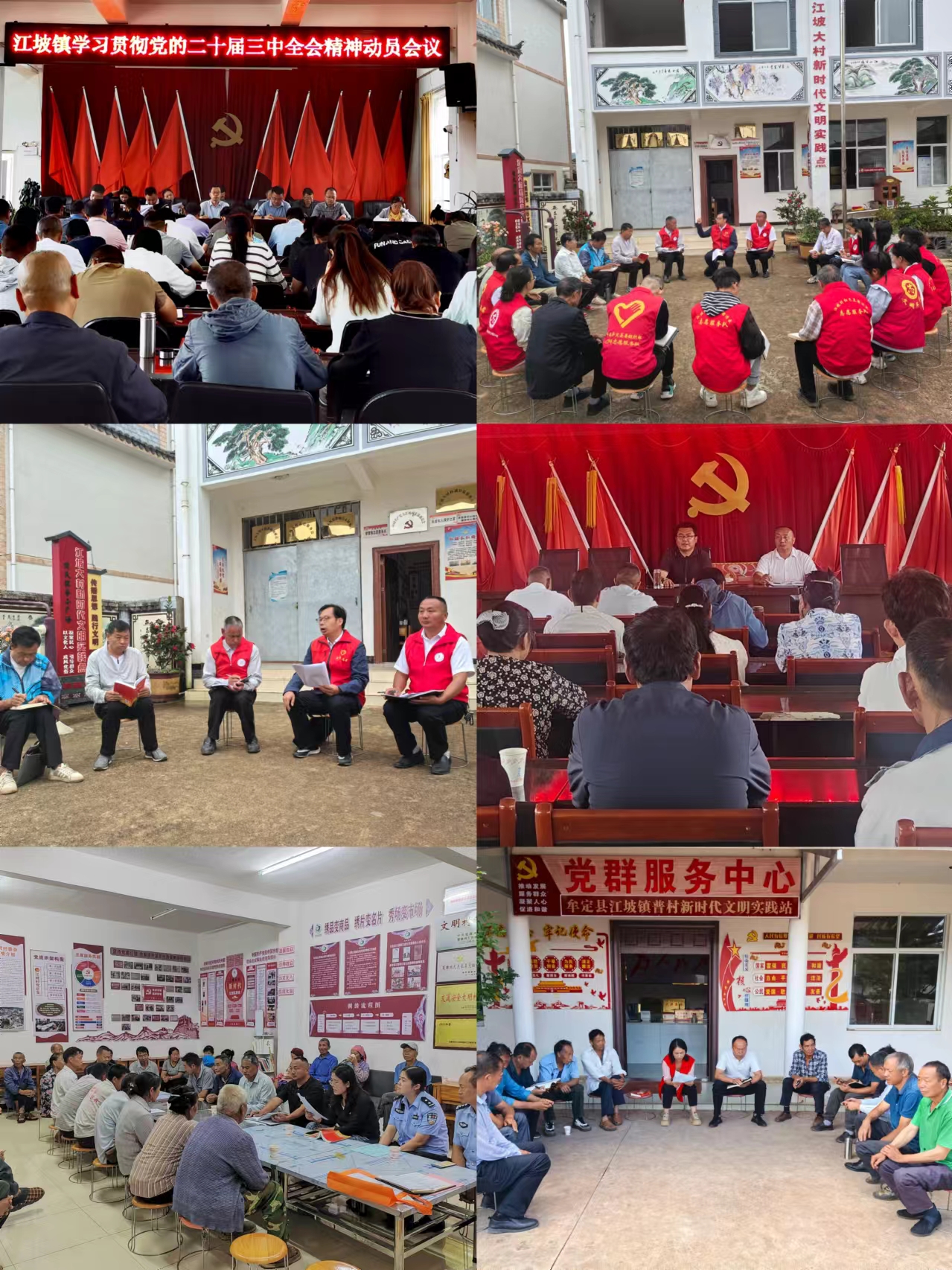 江坡镇把学习宣传贯彻党的二十届三中全会精神作为首要政治任务,于9月2日及时召开了镇学习贯彻党的二十届三中全会精神动员会议。镇党委召开党委会、理论学习中心组学习会等会议,传达学习党的二十届三中全会精神,结合工作实际深入研究贯彻落实意见。镇党政领导班子成员身先示范,纷纷带头深入挂包村组开展理论宣讲,以“关键少数”示范带动全镇广大党员干部“绝大多数”,切实把思想和行动统一到全会精神上来,与党同心同向同行,出实招做实功见实效,推动全面深化改革部署落地落实。