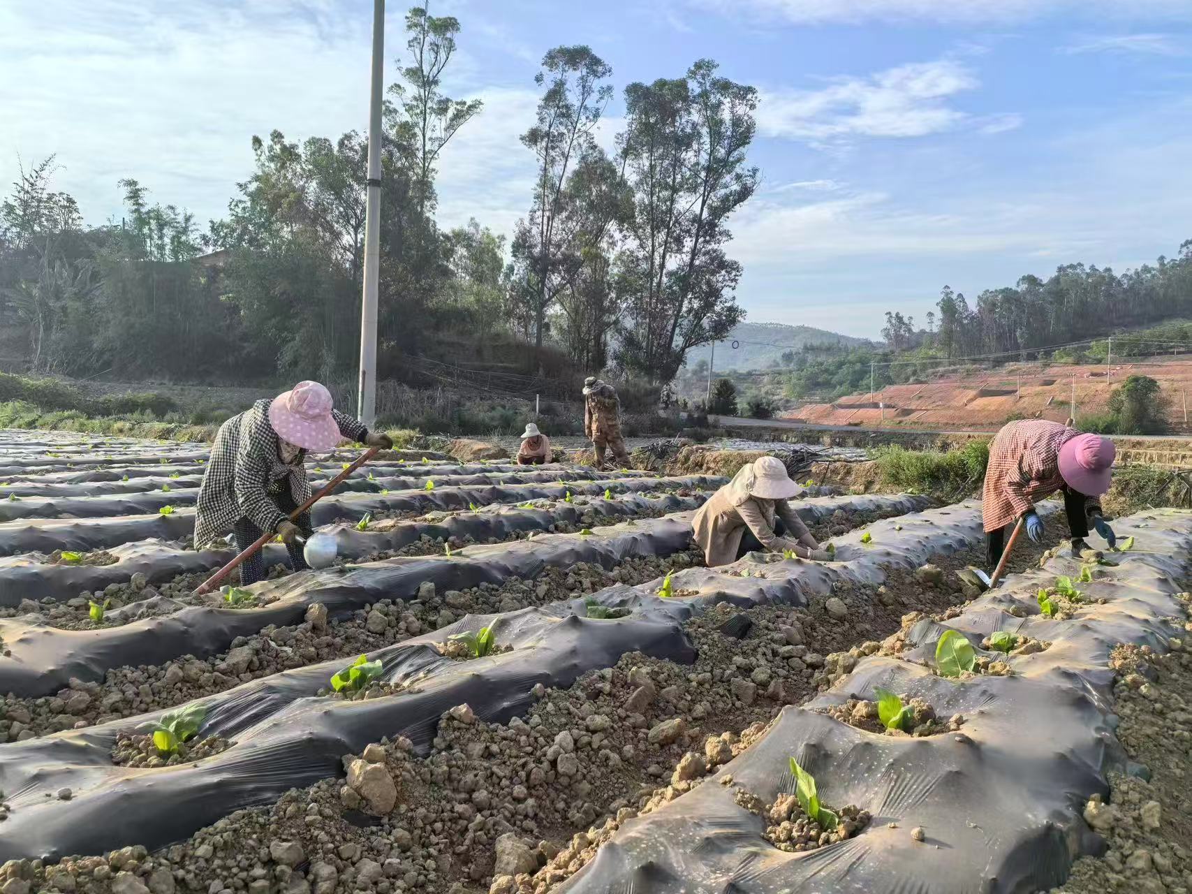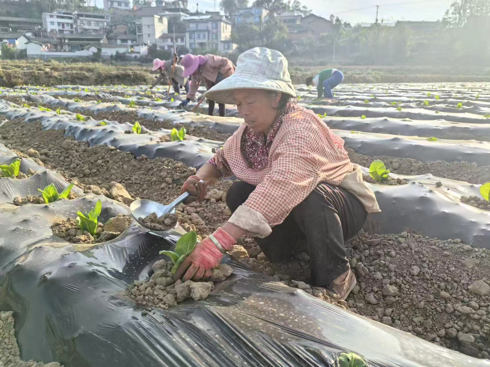 走进高平村烤烟种植基地,只见拉农家肥的车子在机耕路上来回奔忙,整齐排列的覆膜烟地里,三五成群的烟农们正紧锣密鼓地对刚移栽不久的烟苗进行掏苗、施肥、浇水,现场还有技术人员在对烟农进行指导,田间呈现出一派热火朝天的农耕景象。