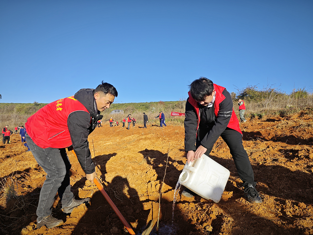植树现场,干部分工协作、默契配合、提苗扶正、挥锹铲土、培实踩平、提桶浇水……每道工序紧密衔接,干劲十足,合力种下500余株红梨树苗,以实际行动推动绿色经济发展和乡村振兴。