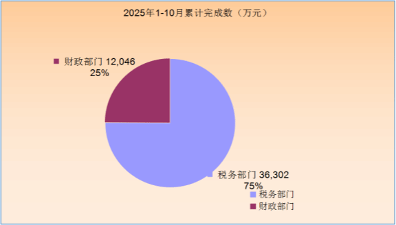 2025年1-10月,税务部门累计完成一般公共预算收入36,302万元,完成全年预算43,769万元的82.9%,比上年28,483万元增收7,819万元,增长27.5%;财政部门累计完成一般公共预算收入12,046万元,完成全年预算9,139万元的131.8%,比上年14,093万元减收2,047万元,下降14.5%。