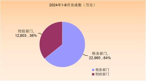 2024年1-8月,税务部门完成一般公共预算收入22,960万元,完成全年预算42,499万元的54%,比上年19,562万元增收3,398万元,增长17.4%;财政部门完成一般公共预算收入12,803万元,完成全年预算6,709万元的190.8%,比上年10,625万元增收2,178万元,增长20.5%。