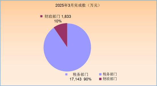 2025年3月,税务部门完成一般公共预算收入17,143万元,完成全年预算43,769万元的39.2%,比上年10,156万元增收6,987万元,增长68.8%;财政部门完成一般公共预算收入1,833万元,完成全年预算9,139万元的20.1%,比上年8,047万元减收6,214万元,下降77.2%。