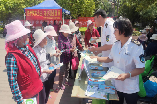 职业病防治“进社区”。4月26日,在牟定县县卫健局牵头组织下,县民政局、县人力资源和社会保障局、县医疗保障局、县总工会、县疾控中心、县卫生健康综合监督执法局多部门联合在共和镇兴和社区化湖广场开展以“坚持预防为主、守护职业健康”为主题的《中华人民共和国职业病防治法》集中宣传活动,通过设置咨询台、悬挂宣传标语、摆放宣传展板、发放宣传资料、测量血压等方式,向群众普及职业卫生知识,并提醒居民要增强职业病防治意识,增强自我保护。