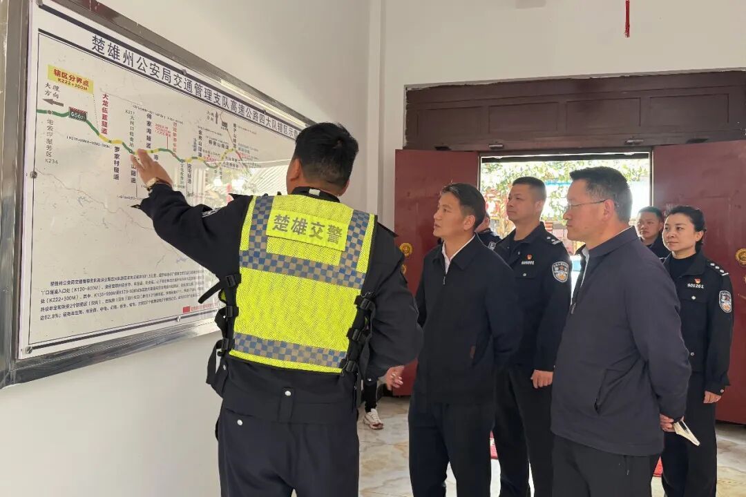 在楚雄州公安局交通管理支队高速公路四大队,左刚实地查看春节警力部署图,详细了解高速车流疏导、事故预防、联勤联动等工作落实情况;认真观摩五型党支部建设成果,对大队以党建带队建、以队建促业务,筑牢基层战斗堡垒、锻造过硬交管队伍的做法给予高度评价。左刚强调,春节是群众出行高峰,道路交通安保任务艰巨、责任重大。全体交管民辅警要始终绷紧安全稳定这根弦,科学调配警力、严密路面管控,全力做好疏堵保畅、隐患排查、违法查处等工作,坚决守护人民群众出行安全;要持续深化五型党支部建设,把党建优势转化为工作实效,以过硬作风、务实举措保障辖区道路交通安全有序,让群众度过一个平安、畅通、祥和的新春佳节。殷殷关怀暖警心,谆谆嘱托鼓干劲。一线民辅警纷纷表示,将关心关怀转化为履职尽责的强大动力,坚守岗位、忠诚履职,全力以赴守好平安路、护好团圆年,以实际行动践行人民公安为人民的庄严承诺。县委常委、县委办主任邓示锦,县人民政府副县长、县公安局党委书记、局长起成林参加慰问。