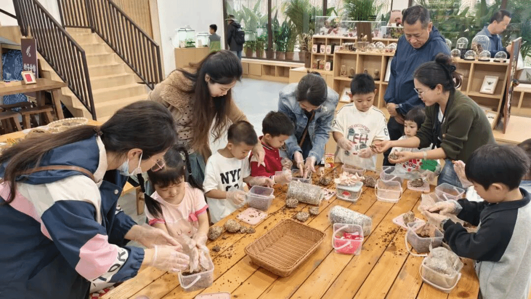 在园区内的西双版纳自然博物馆里,几十位小朋友正在工作人员的带领下进行研学活动——种菌菇,园区设计了三条研学路线,分别是:菌子研学、夜游小侦探、户外自然教育。通过有趣的活动,让孩子们深入了解多样而迷人的雨林生态系统,在心里种下保护大自然的“种子”。