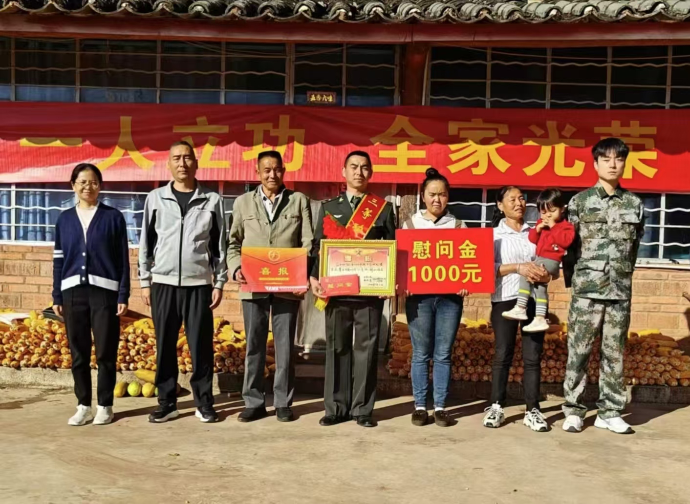 近日,牟定县退役军人事务局和县人武部有关同志共同到安乐乡猫街村委会力古董村,及时为立功受奖的军人家庭送上荣获三等功喜报。喜报送到家后,县乡村三级共同为立功军人家庭举行了送喜报仪式,为其悬挂“一人立功全家光荣”荣誉横幅,为回家探亲的立功现役军人佩戴绶带和大红花,给其父母送交喜报,并送上县人民政府的1000元奖励资金,热烈喜庆的浓厚氛围,洋溢出尊崇军人尊重军人家属的浓浓深情,激发了现役军人安心服役,再立新功的热情,家属表示将积极拥军支持好部队和地方工作。