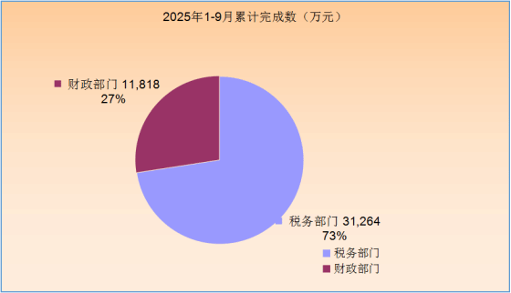 2025年1-9月,税务部门累计完成一般公共预算收入31,264万元,完成全年预算43,769万元的71.4%,比上年25,204万元增收6,060万元,增长24%;财政部门累计完成一般公共预算收入11,818万元,完成全年预算9,139万元的129.3%,比上年13,802万元减收1,984万元,下降14.4%。