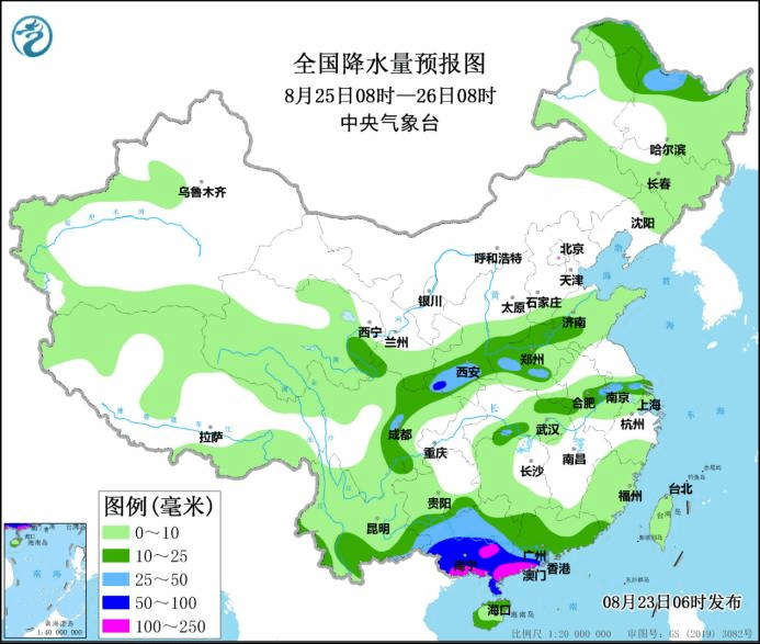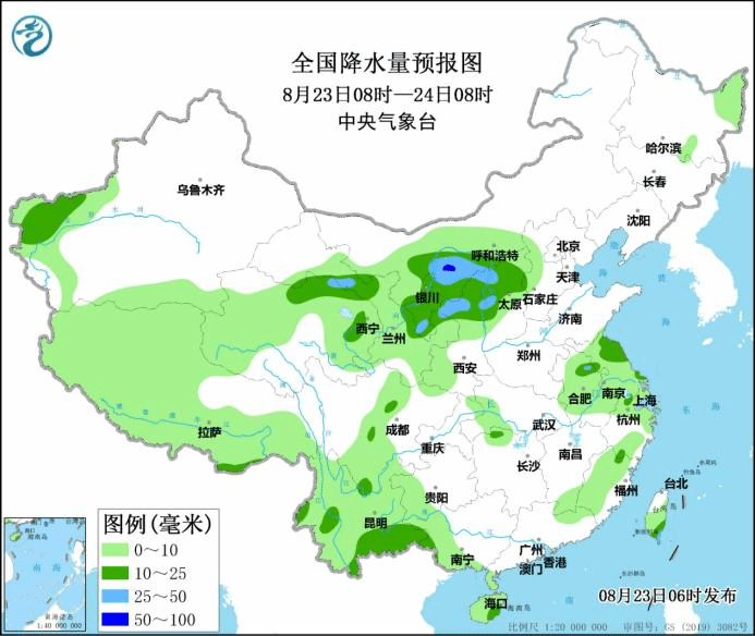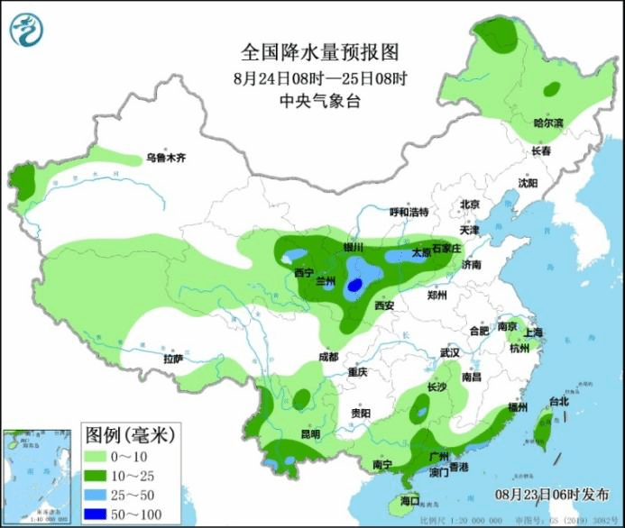 图1 全国降水量预报图(8月23日08时-24日08时)