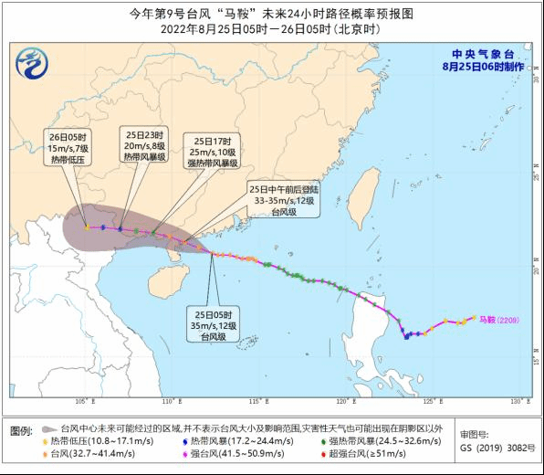 预计,“马鞍”将以每小时30公里左右的速度向西偏北方向移动,强度变化不大,即将于今日上午至中午在广东省阳西到雷州一带沿海登 陆(33~35米/秒,12级,台风级,见图1),登 陆后强度逐渐减弱。中央气象台25日06时发布台风橙色预警。