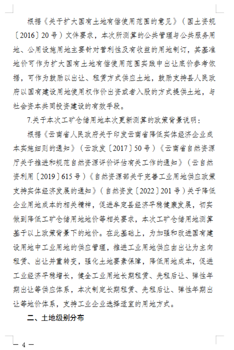 根据《国土资源部办公厅关于加强公示地价体系建设和管理有关问题的通知》(国土资厅发〔2017〕27号)以及《云南省自然资源厅关于推进和规范自然资源评价评估有关工作的通知》(云自然资利用〔2019〕615号)《云南省自然资源厅关于做好2022年度自然资源评价评估工作的通知》(云自然资利用〔2022〕523号)《楚雄州自然资源和规划局关于开展基准地价更新评价工作的通知》(楚自然资权益〔2023〕2号)文件要求,为满足牟定县土地管理工作需求,完善土地价格体系,开展牟定县中心城区及新桥镇等6个乡镇集镇规划区城镇土地定级与基准地价制定。牟定县中心城区城镇土地定级与基准地价制定成果于2024年3月29日已通过云南省自然资源厅验收,牟定县新桥镇等6个乡镇集镇规划区城镇土地定级与基准地价制定成果于2024年1月30日已通过楚雄州自然资源和规划局验收。