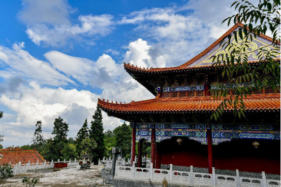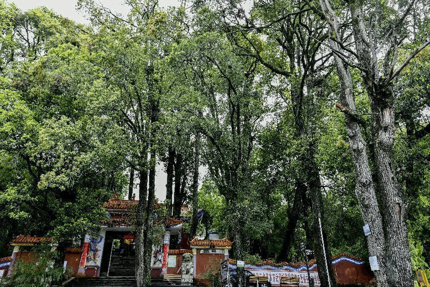 六、验道茶。绕顶寺是化佛山位置最高的寺院,海拔2450米,是观日出、看云海、听松涛的最佳位置。因常有云雾缭绕,故又名云顶寺。这里有一株茶花名为“验道茶”,又名“倒栽茶”,树高2丈、胸径0.528米,树龄在200年以上,花色艳红、花大如碗,九蕊十八瓣,是云南茶花中的珍品。