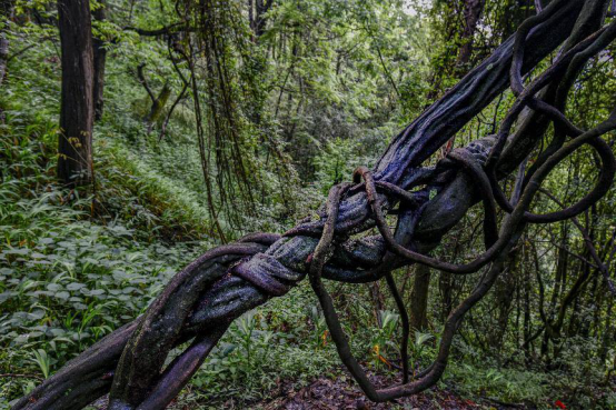 二、千年藤王。旃檀林左边滴水崖瀑布上方古藤攀缓,古木蔽日,极为幽静。有株巴豆藤胸围2.32米,藤展60多米,覆盖面积有2000余平方米,堪称滇中之最,化佛山一绝。