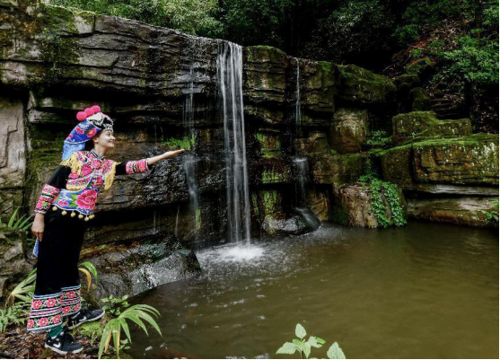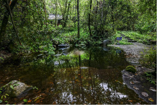 三、九叠泉。九叠泉是化佛山景致最美、最有灵气的地方。这里古木参天,浓阴蔽日,人行道中,如在画中游。九叠泉位于千年古藤下,泉水自滴水崖急切滴落,击石而碎,似数珠落盘,透过林中斑驳的阳光,水珠晶莹剔透,那幽静清新的声音,使人浮躁心灵得到片刻的宁静。九叠泉下分台修建有7个水潭,水清见底,如明镜不染尘埃。