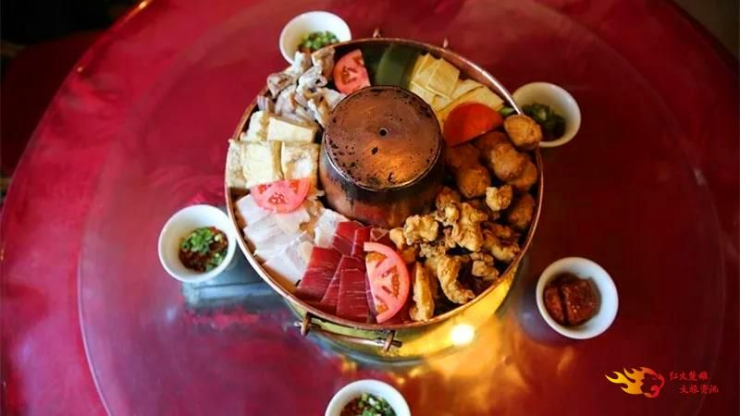 牟定县共和镇北塔村手工特制的铜锅,是烧煮、盛放牟定铜炊锅菜的唯一器具,锅体中端留足放进木炭、明火燃料的空间,边沿一圈入煮菜品,有时鲜蔬菜、豆腐丸子、粉丝、豆腐皮、鲜肉、火腿等,荤素搭配极为合理,保证让你好吃到停不下来。