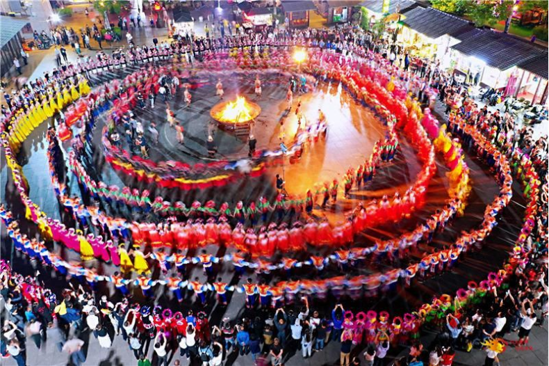 左脚舞广场是彝和园夜晚最热闹的地方。当夜幕降临,华灯初上,巨大的篝火燃起来之际,一场歌与舞的盛宴也拉开帷幕。铮锋作响的三弦琴,激情四射的舞步,里三圈外三圈,身着艳丽彝族服饰的群众在这里踏歌起舞,欢快无比。