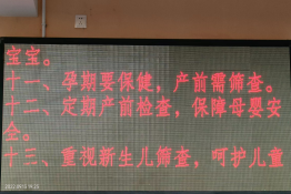 在卫生院内广泛宣传,设立电子显示屏,每天滚动播放预防出生缺陷标语口号和相关知识,营造重视和关注出生缺陷防治工作的良好氛围。